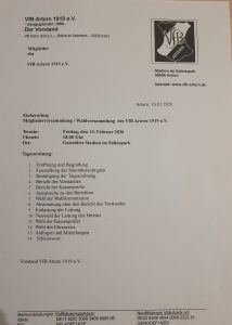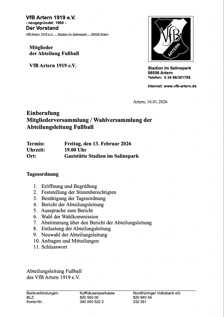 Einladung Wahl 2026 VfB ArternAlle Mitglieder des VfB Artern sind am 13.02.2026 recht herzlich eingeladen, an unserer Mitgliederversammlung teilzunehmen! Es wird sowohl der Vorstand, als auch die Abteilungsleitung Fußball neu gewählt.